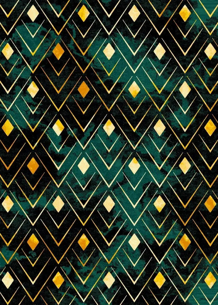 TC9178-Q7-T2 là mẫu thảm trang trí mang đậm tinh thần Art Deco kết hợp hình học hiện đại, nổi bật với họa tiết zigzag – hình thoi được sắp xếp nhịp nhàng trên nền xanh ngọc đậm pha vàng ánh kim. Thiết kế vừa cổ điển sang trọng, vừa trẻ trung cá tính, rất phù hợp với những không gian nội thất có gu thẩm mỹ rõ ràng.