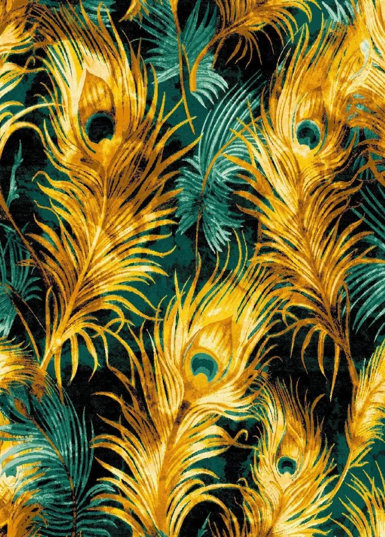 Thảm TC9224-Q9-T1 gây ấn tượng mạnh bởi thiết kế họa tiết lông công – biểu tượng của may mắn, quyền quý và thịnh vượng trong phong thủy cũng như văn hóa Á – Âu. Những đường nét lông công mềm mại được thể hiện bằng gam màu vàng ánh kim, nổi bật trên nền xanh ngọc trầm, tạo nên một tổng thể nghệ thuật quyến rũ, sang trọng và đầy sức sống.